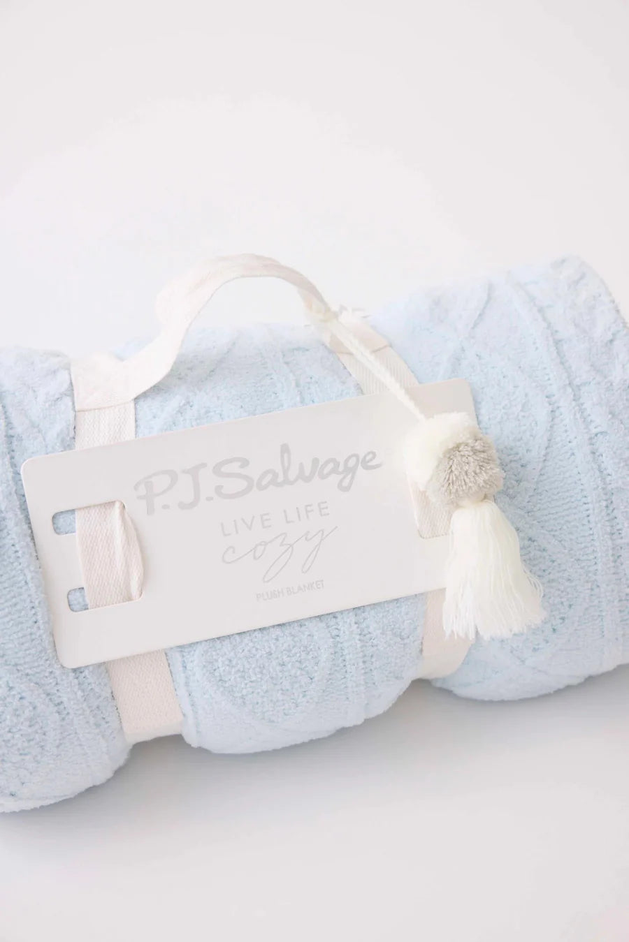 Keep that chill at bay!  You'll want this handy blanket rolled up in a nearby basket for a quick cozy-grab to keep feet warm all year. Measures 50" x 65". Comes wrapped in a carry-strap handle with pom pom tassel. A perfect, ready-made gift! Fabric Content: 100% Polyester