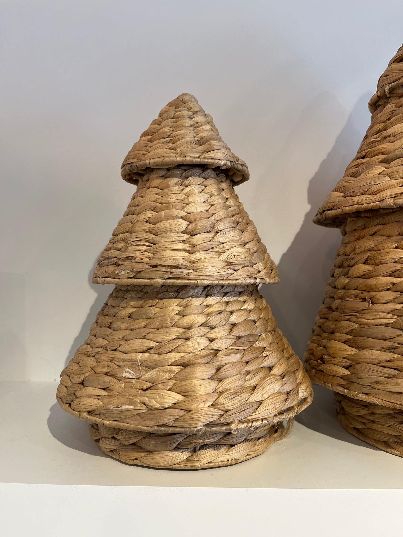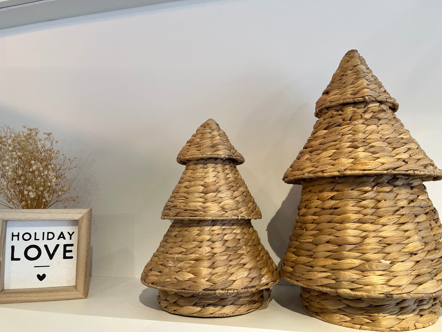 Their neutral tones and sculptural silhouettes complement both modern minimalist and classic holiday themes. Crafted from sustainable hyacinth fibers, each piece offers rich, tactile detail that feels earthy and warm.