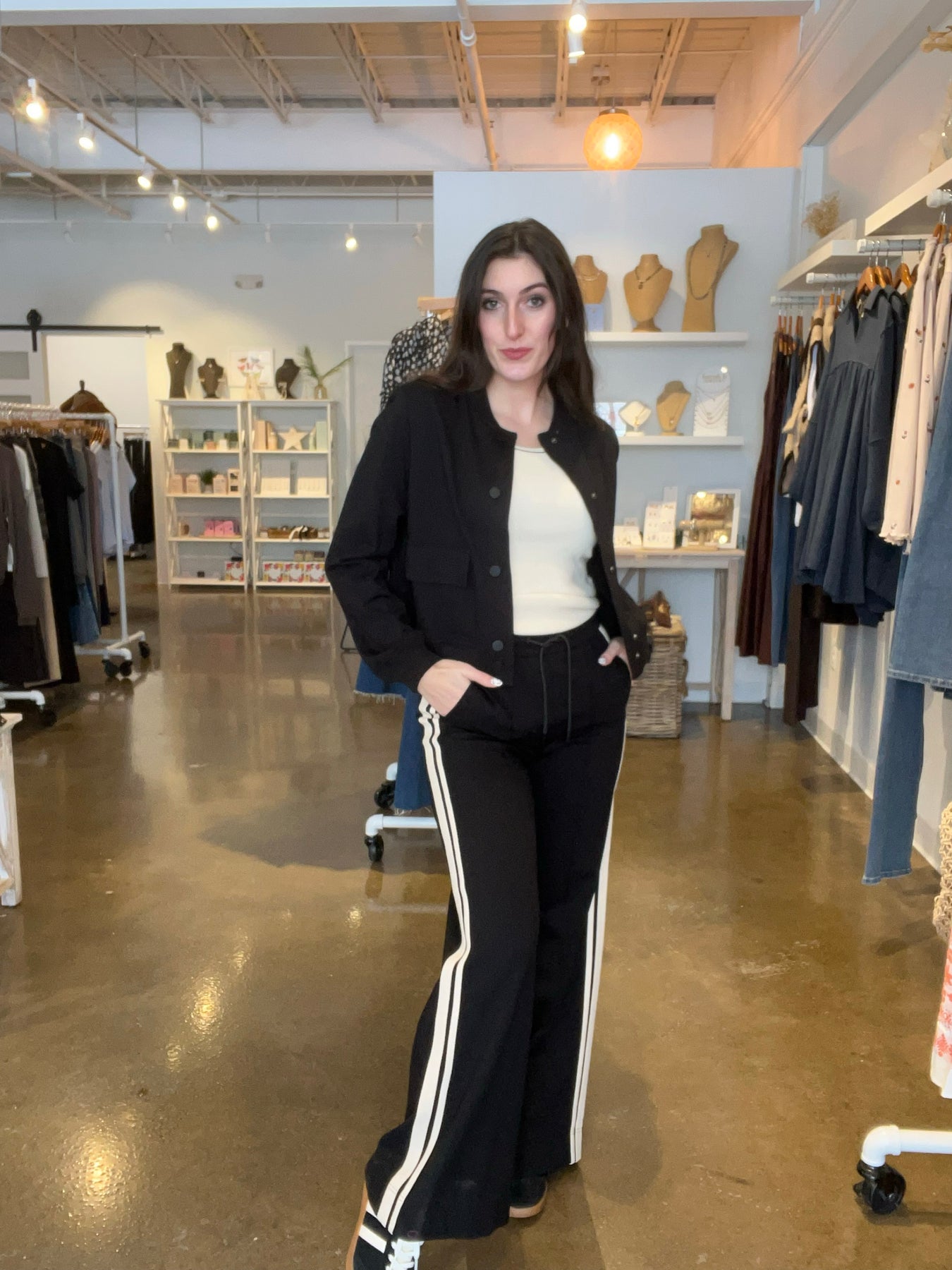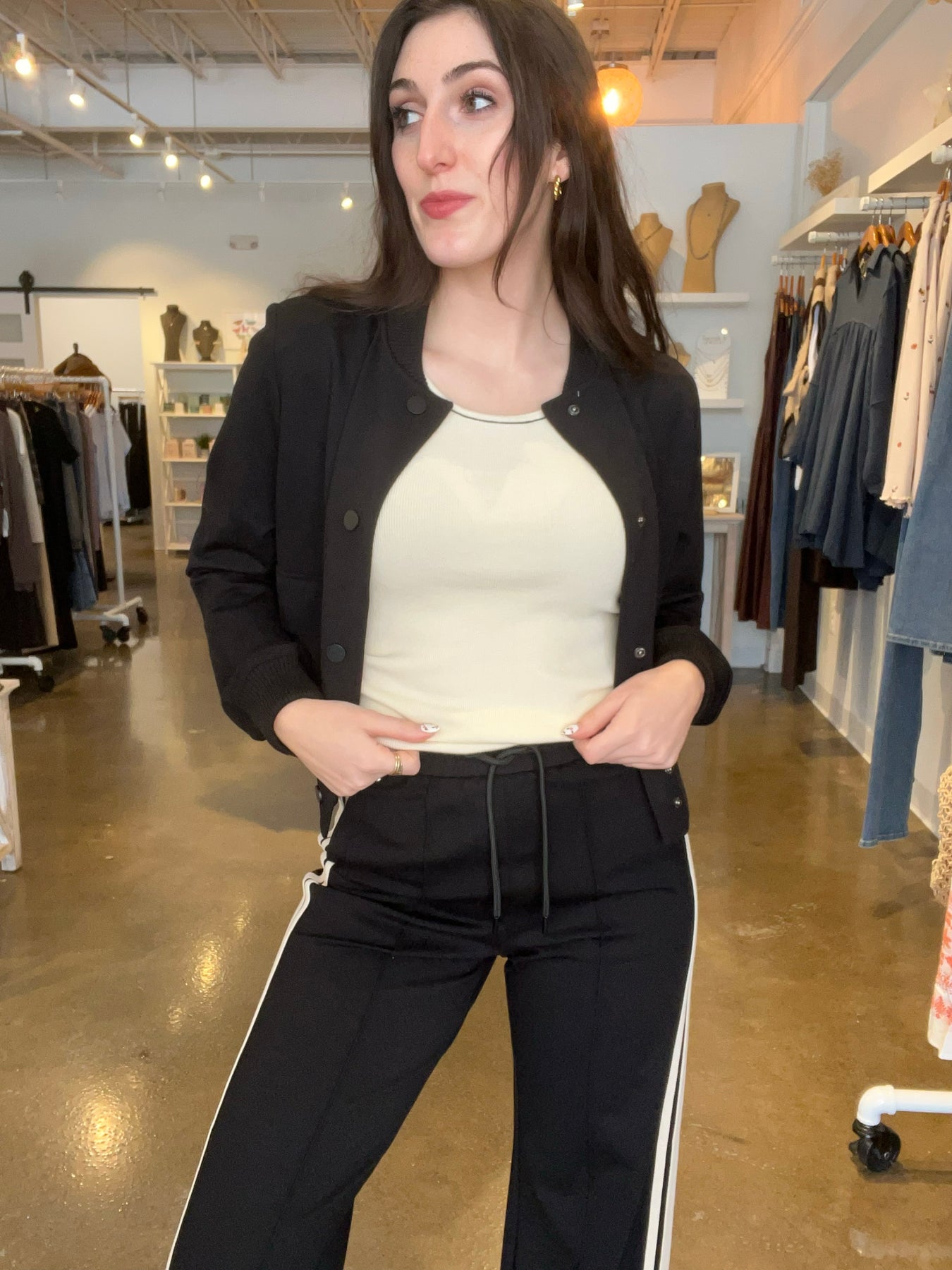 Elevated track pant in Black with cream striping down the pant leg. Elastic drawstring waist, seam down the front of pant leg, front slant pockets and back pockets. Paired with the Classy Bomber Black jacket makes it a great travel set. Fabric content: 67% rayon 28% nylon 5% spandex
