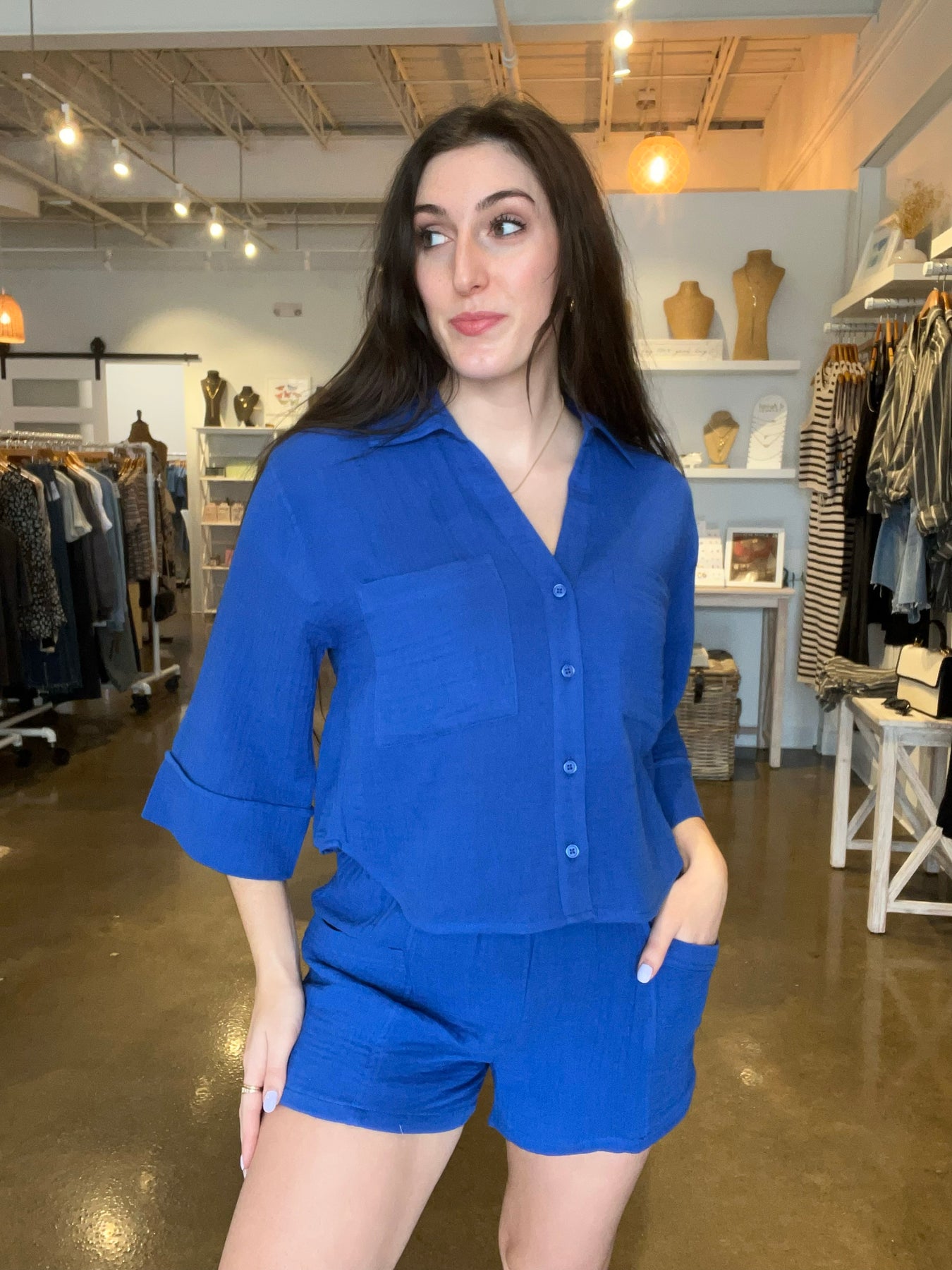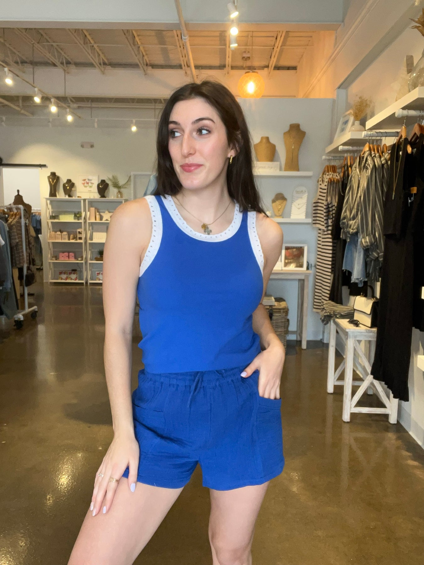 A 100% cotton fabric brings soft texture to this airy short. Detailed with a high-rise fit, elastic waistband, and patch pockets, it's the perfect blend of effortless and cool. Pair it with our matching top or any simple tank. Color: Nautical. Fabric Content: 100% Cotton