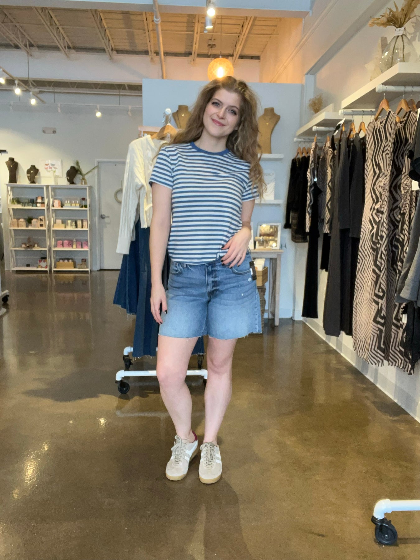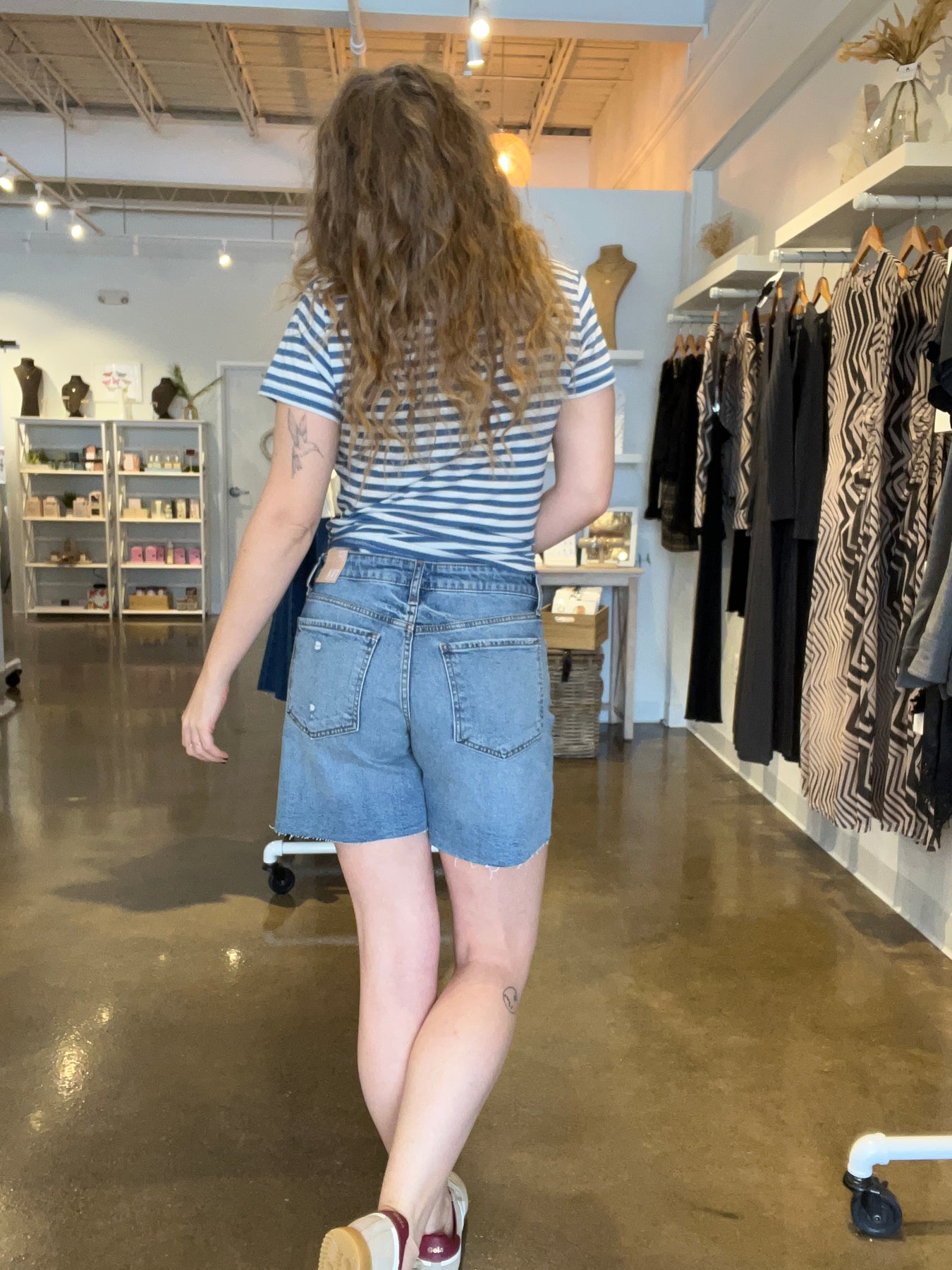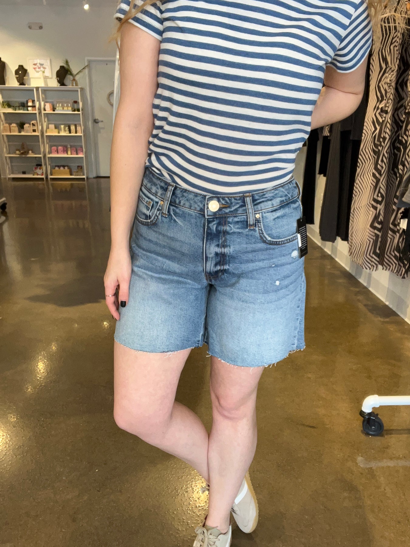 These mid-rise shorts feature a longer inseam, medium wash, and subtle distressing on the front and back, and raw hem for a stylish, laid-back look. Perfect for everyday wear. Made by KUT! Inseam: 6" Rise: 10 1/2" Fabric content: 99% cotton 1% spandex