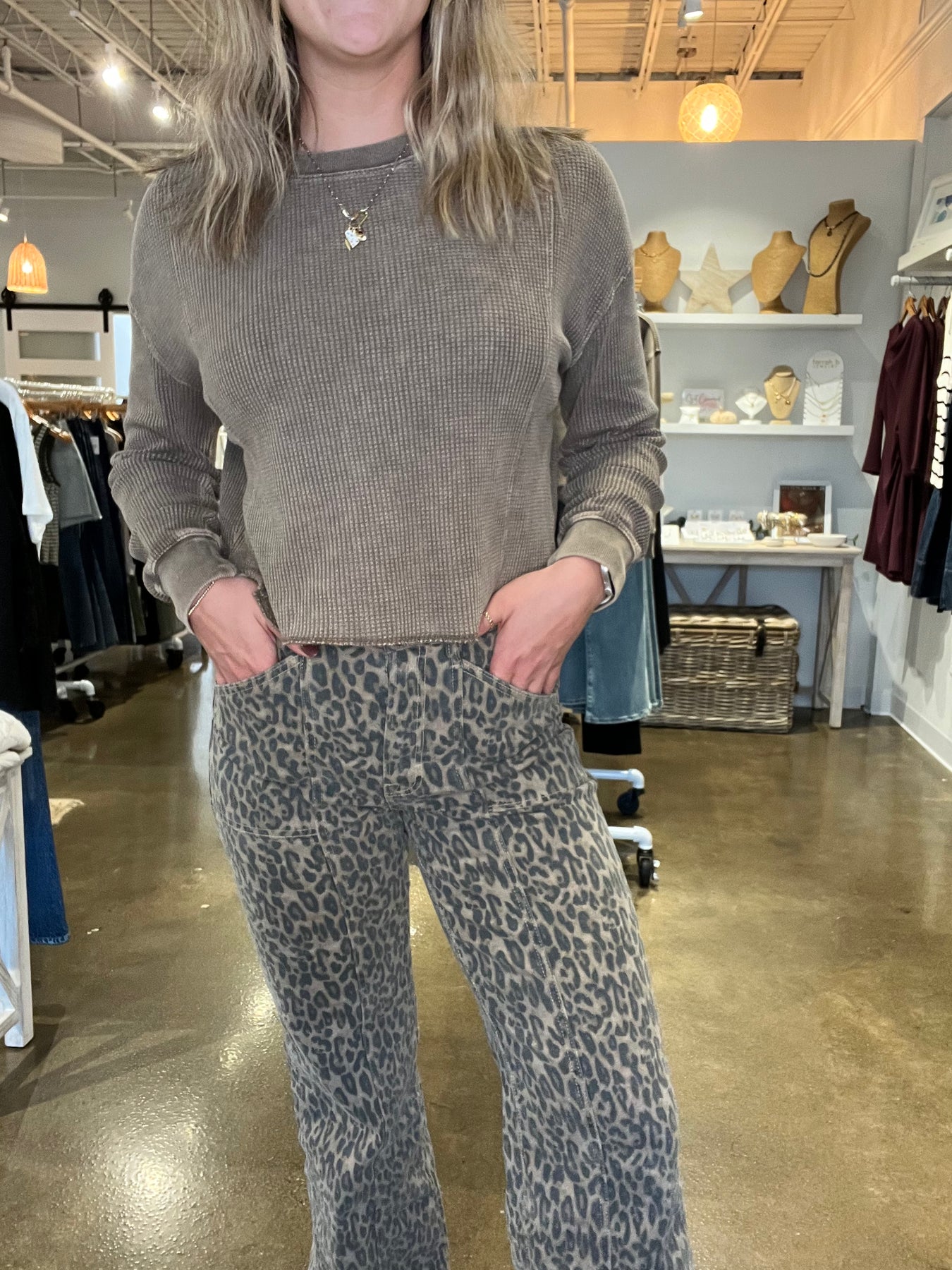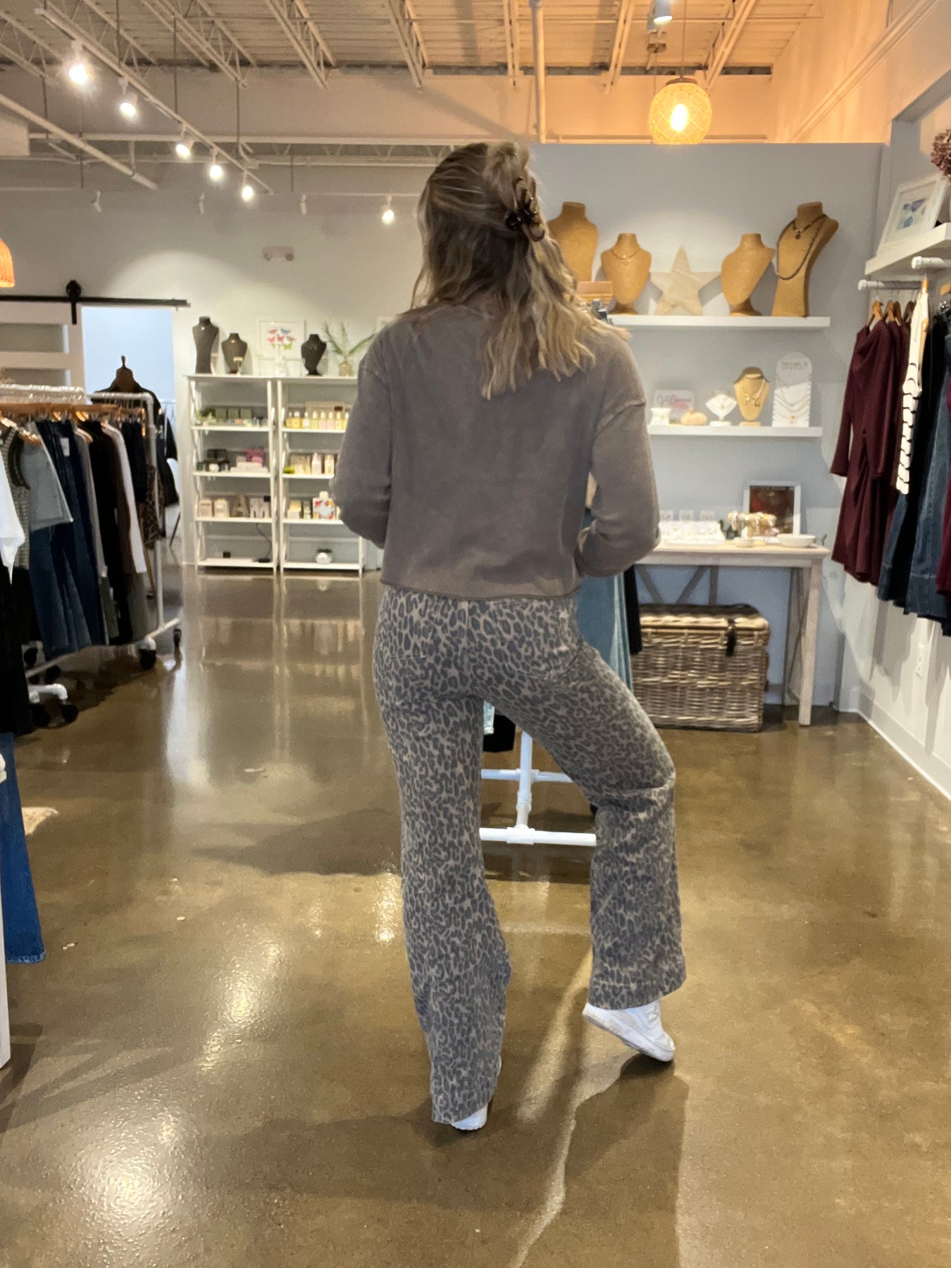 Unleash your wild side with the HIDDEN Happi Cheetah Flare Stretch Jean! These trendy jeans offer a subtle, sophisticated animal print with a flattering flare that elongates your look. Comfort and style? Yes, please! Fabric Content: 94% Cotton, 5% Polyester, 1% Spandex.
