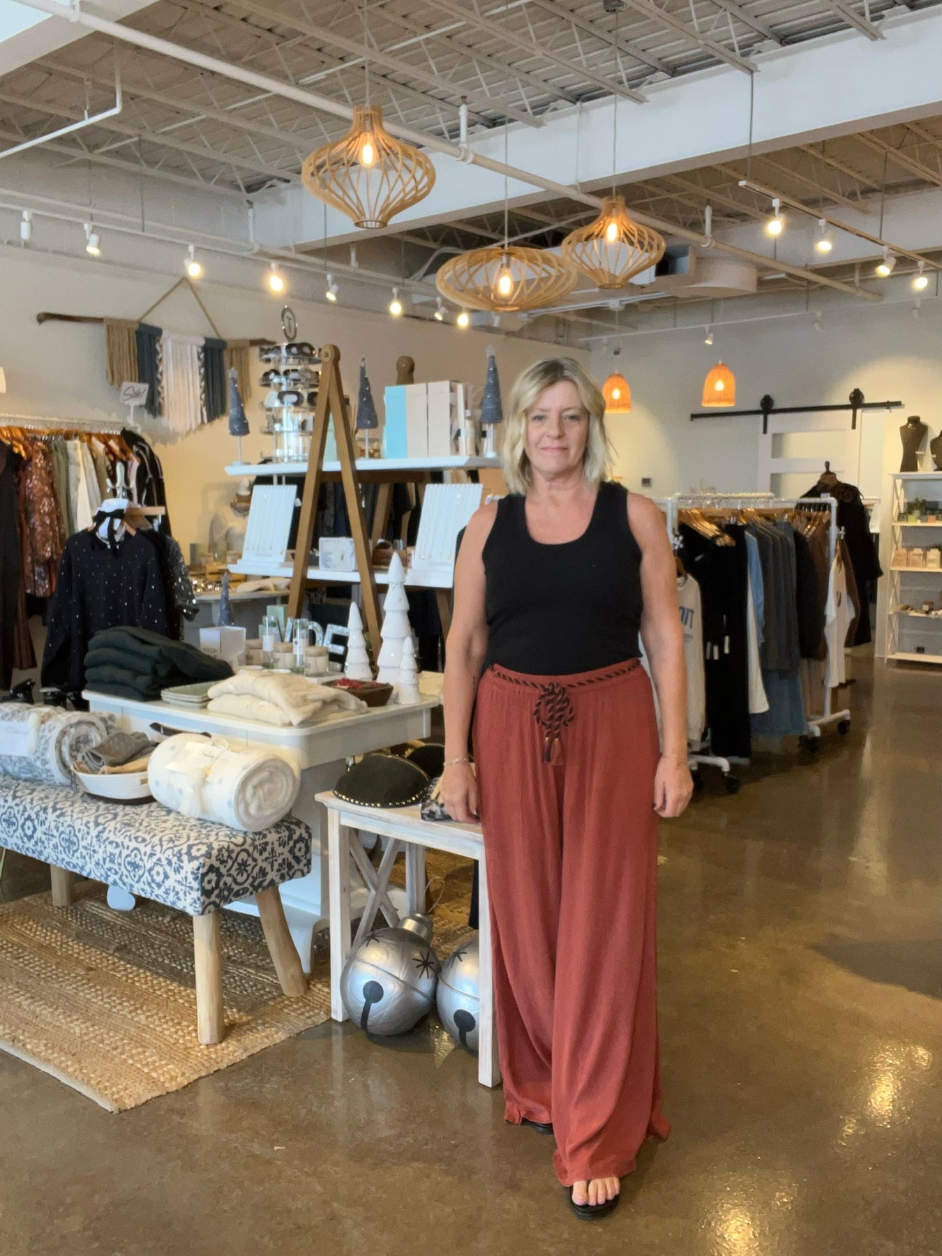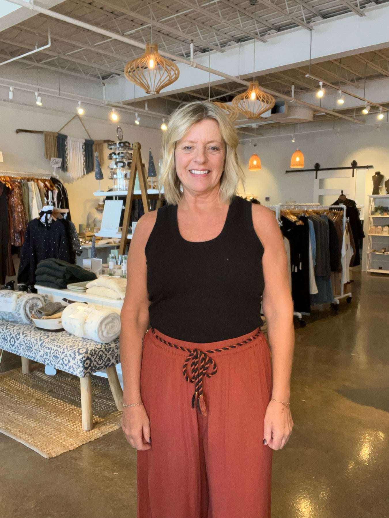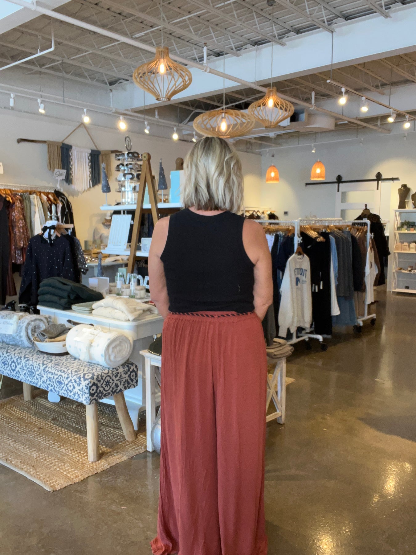 Flowy, comfortable, and effortlessly elevated — these Elan wide leg pants are a resort-wear essential. Crafted in a rich dark cayenne crinkle-textured fabric, the pants feature a smocked elastic waist for comfort and a braided rope tie with tassel ends for that perfect coastal touch. Fabric Content: 100% Viscose