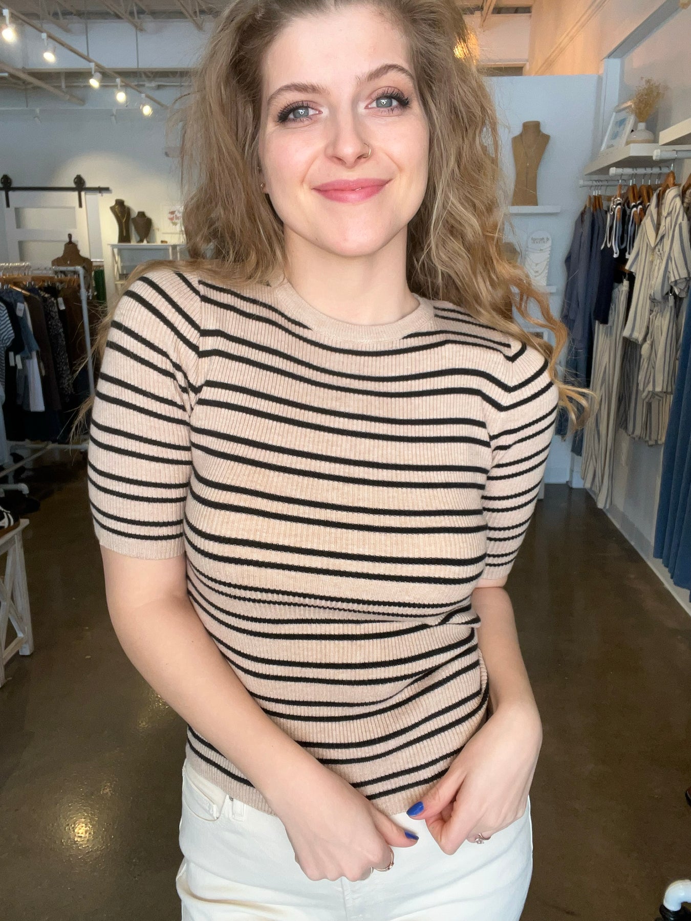 The Acama Sweater is a short-sleeve crewneck sweater featuring a striped rib knit and a comfortable stretch-to-fit silhouette. Style this easy knit top with a pair of denim or a flowy skirt for an effortless everyday look. Made by Pink Martini. Fabric content: 90% viscose 10% nylon
