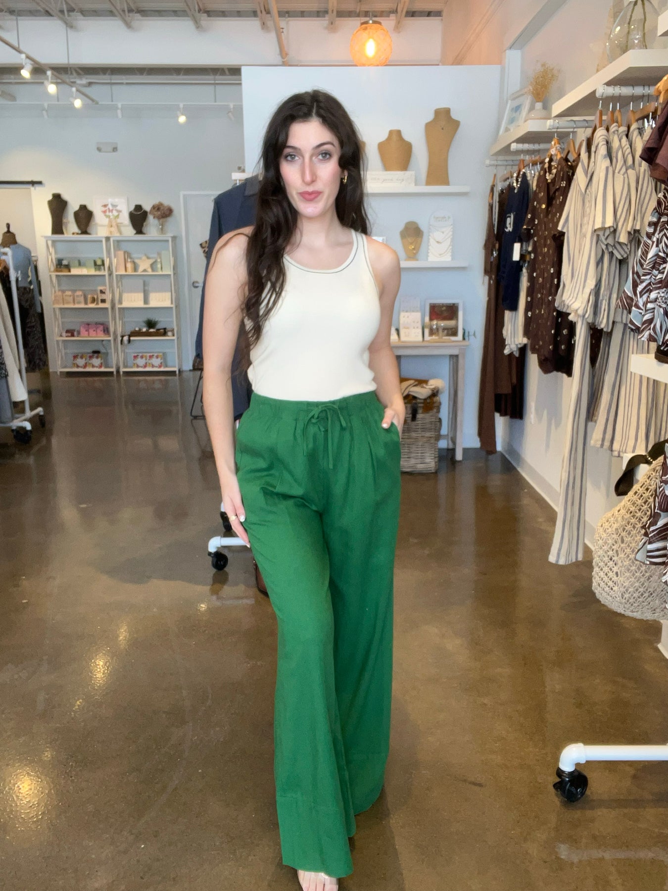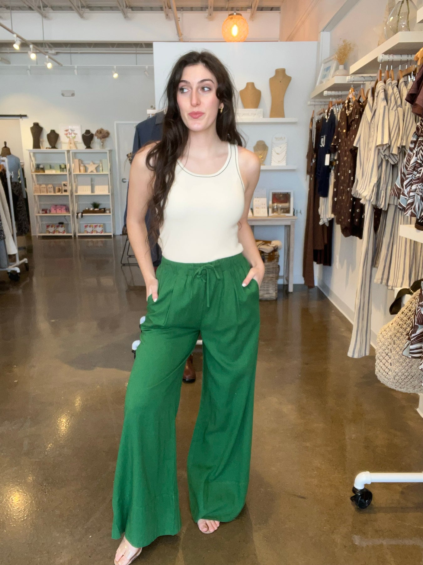 Linen-blend wide-leg pants with elasticized waistband and drawstrings. Features side pockets, built-in lining shorts and a front pleat on each side. Fabric Content: 70% Viscose, 30% Linen