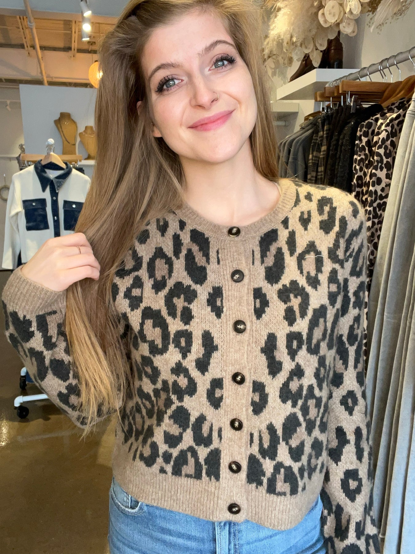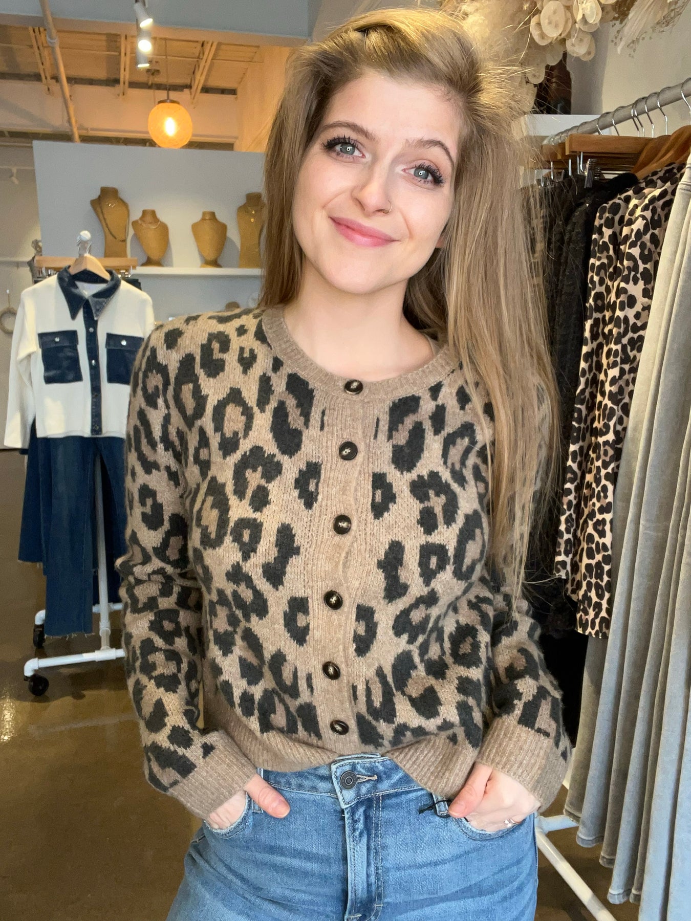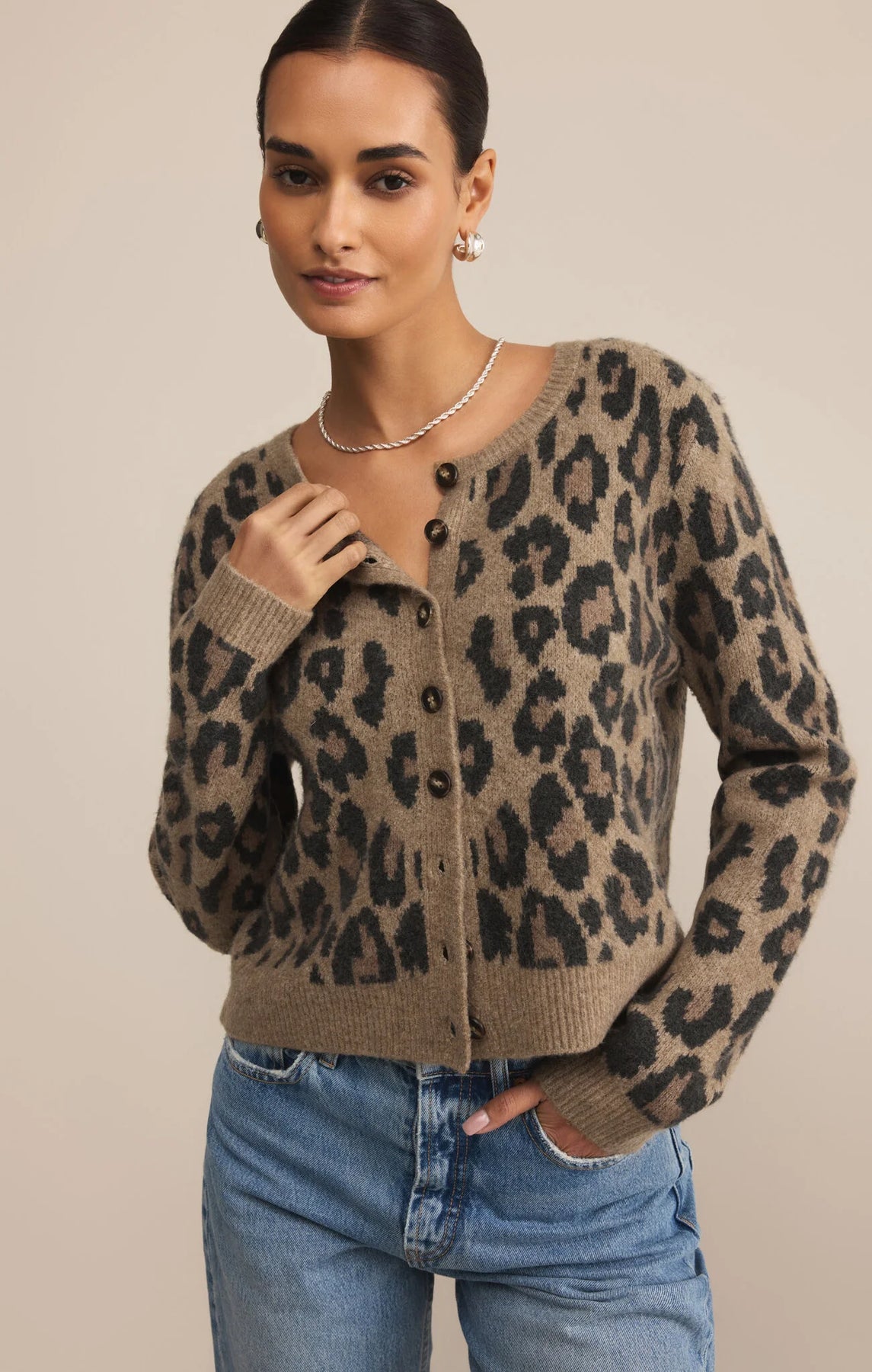 A playful update to the classic cardigan, this jacquard-knit style features an allover animal pattern and soft midweight feel. It’s made of cozy spring yarns with a button front and relaxed fit, perfect for styling over basics. Fabric Content: 44% Acrylic, 43% Nylon, 10% Viscose, 3% Spandex