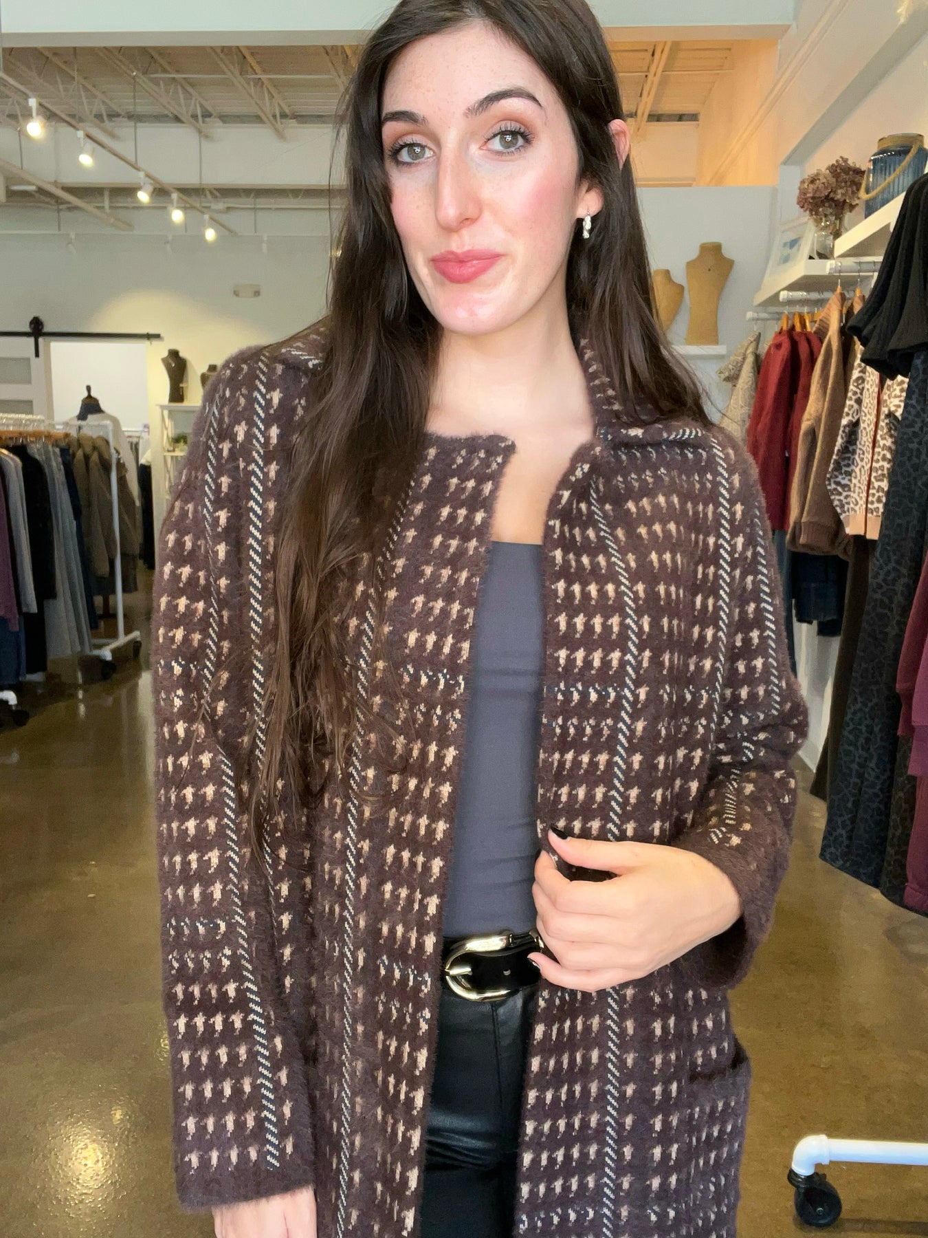 Classic meets cool in the Marceau Houndstooth Coat by Sage The Label. This statement knit features a bold houndstooth pattern and slightly oversized fit - perfect for layering over your favorite basics for a polished, trend-forward finish. Fabric content: 100% nylon