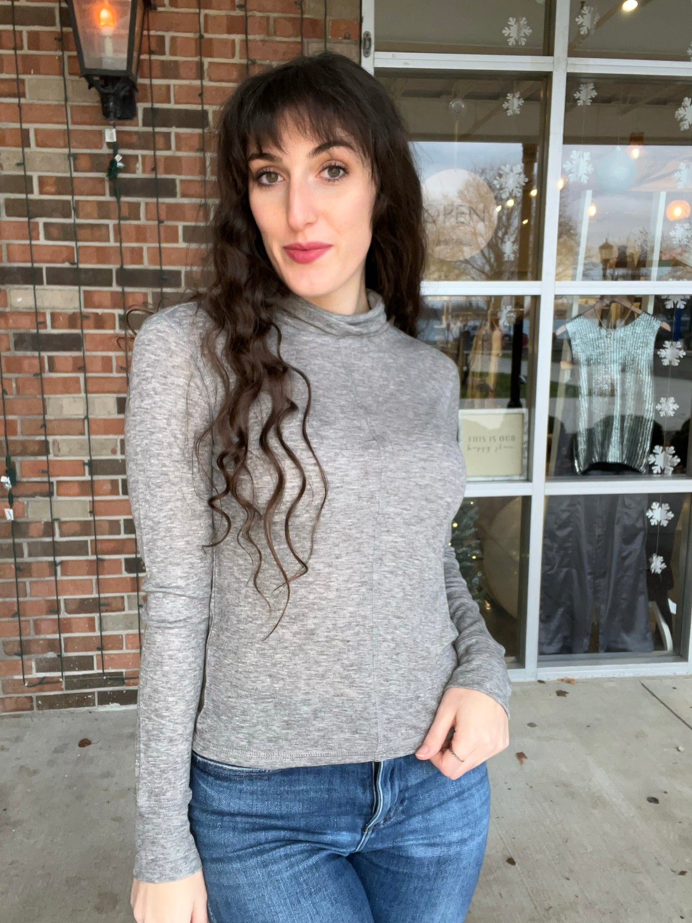 Super soft and lightweight mock neck long sleeve top. Heather charcoal color with exposed seam detail. Great layering piece. Fabric content: 80% lyocell 20% wool