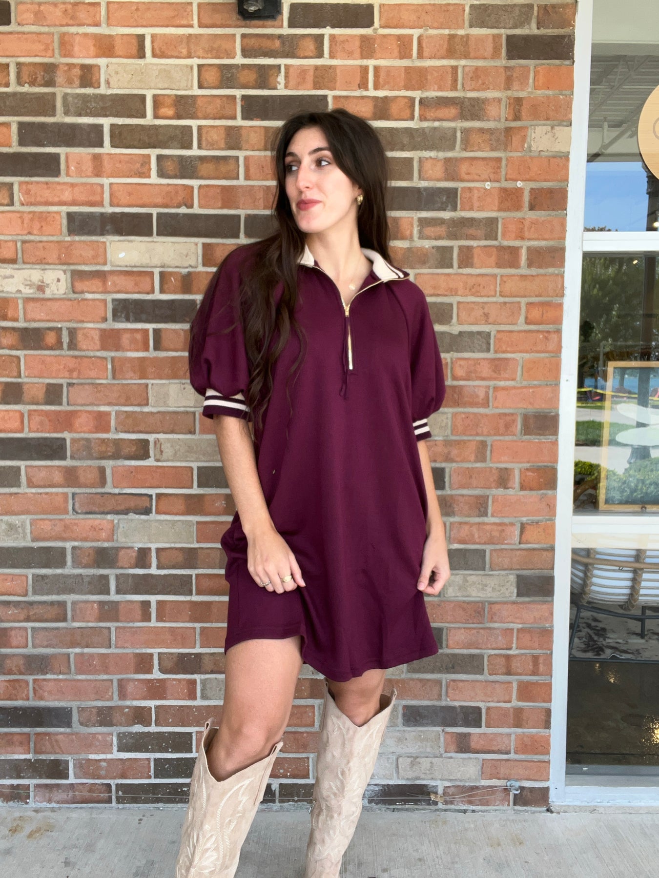 Solid mini dress with front zipper and multicolor ribbed trim. Side pockets. Unlined. Knit. Non-sheer. Lightweight. Fabric Content: 55% RAYON, 40% POLYESTER, 5% SPANDEX