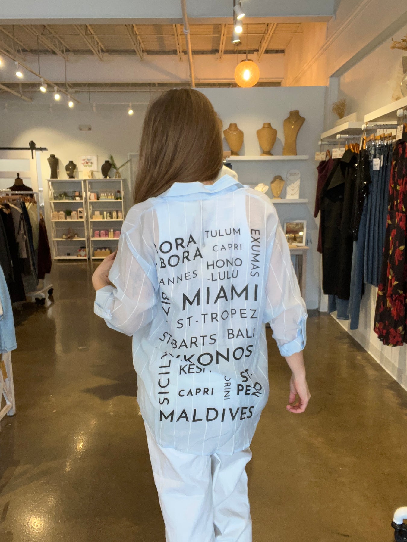 Bring vacation vibes to your wardrobe with the Vista Button-Down Top. This chic top showcases graphics on the back featuring everyone's favorite destinations. Elevate your casual style and let your imagination wander with Vista, making it the perfect choice for a laid-back and trendy look. Fabric Content: 100% Cotton